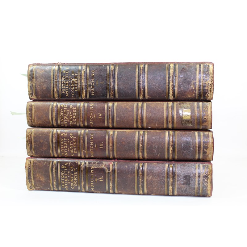 Hutchins, John. The History and Antiquities of the County of Dorset, 4 volumes, third edition, 127 engraved plates, maps and plans, lacks plate 'Reprint of Holme' in volume 1, folding pedigrees, a few plates and leaves repaired, contemporary half morocco, rebacked preserving original spines, ex-library copy, with usual stamps, folio, Westminster: John Bowyer Nichols, 1861-1870