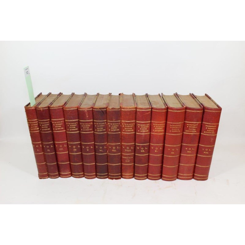 Norris, Hugo and Charles Herbert Mayo, editors. Notes and Queries for Somerset and Dorset, volumes 1-13 only, light spotting, contemporary red half calf, volumes 1 and 7 with boards detached, 8vo, Sherborne: J.C. Sawtell, 1890-1913