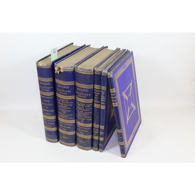 Pitt-Rivers, Augustus Henry Lane Fox. Excavations in Cranborne Chase, Rushmore, volumes 1, 2 4 and 5 only, first edition, plates, some folding, occasional browning, 4to, Privately Printed, 1887-1905; King John's House, Tolland Royal, 4to, Privately Printed, 1890; Antique Works of Art from Benin, Privately Printed, 1900, all original blue cloth gilt, spines lightly chipped at head (7)