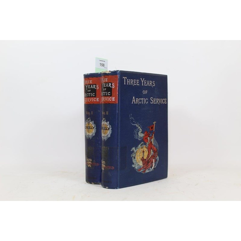 Greely, Aldolphus W. Three Years of Arctic Service. An Account of the Lady Franklin Bay Expedition of 1881-84, 2 volumes, first edition, portrait frontispiece, plates, folding map in pocket at end, lightly watermarked, original pictorial cloth gilt, ex-library copy, with usual markings, spines lightly chipped, 8vo, New York: Charles Scribners, 1886