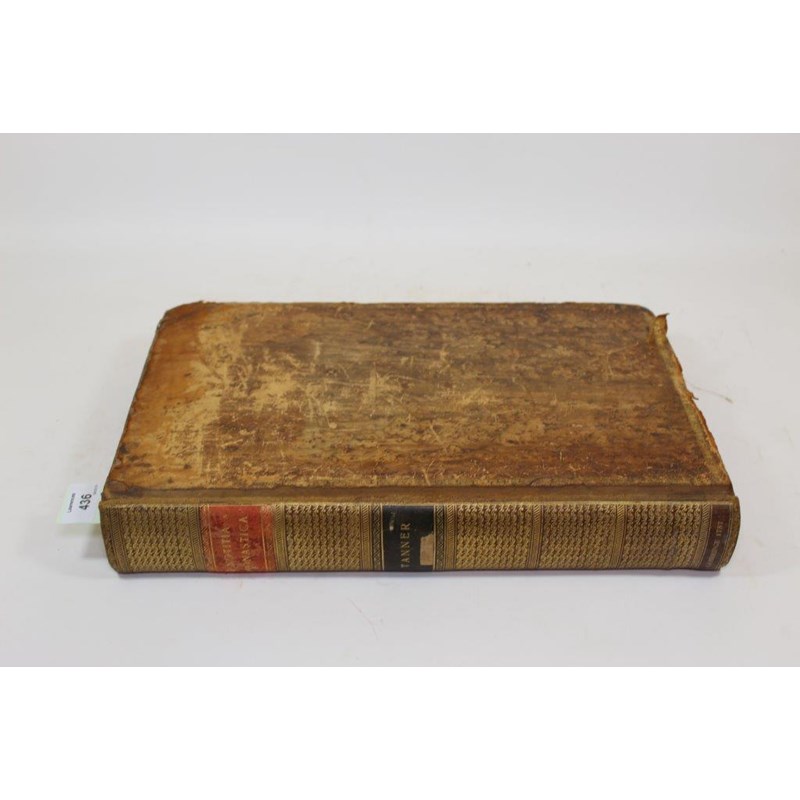 Tanner, Thomas. Notitia Monastica; or, An Account of all the Abbies, Priories, and Houses of Friers, formerly in England and Wales, engraved portrait frontispiece, 3 engraved plates of arms, some spotting, frontispiece offset to title, contemporary etched calf, ex-library copy, without stamps, neatly rebacked, folio, Cambridge: University Press, 1787