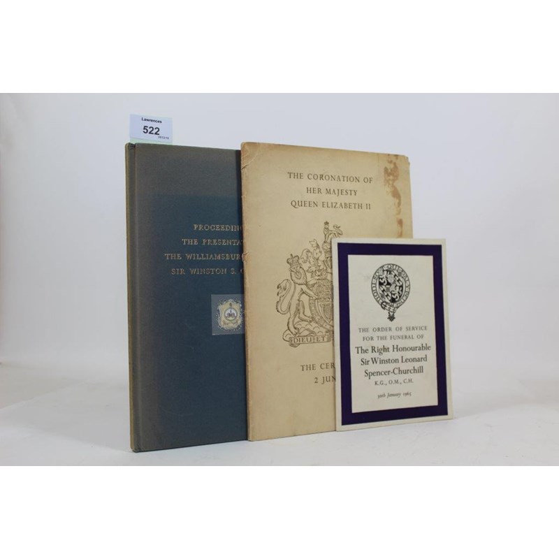 [Churchill, Sir Winston Spencer] Proceedings of the Presentation of the Williamsburg Award By the Trustees of Colonial Williamsburg to the Rt. Hon. Sir Winston S. Churchill, at Drapers' Hall, London, December 7, 1955, original cloth, 8vo, Colonial Williamsburg, 1957; The Order of Service for the Funeral of the Right Honourable Sir Winston Leonard Spencer-Churchill, K.G., O.M., C.H., original wrappers, 8vo, [London]: H.M.S.O., 1965; and a copy of the order of service for the coronation of Queen Elizabeth II, 8vo (3)