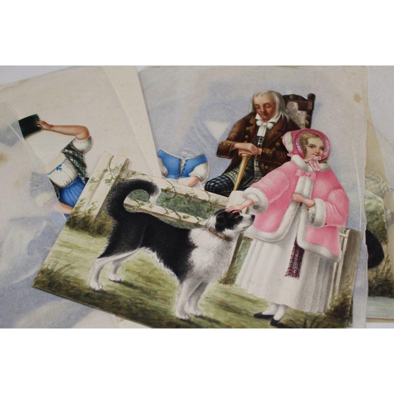 [Anon] Mabel Lee. A manuscript ballad recounting the story of a young girl, from rags to riches, on 7 sheets, including title page dated 1850 with a pen and ink drawing of a country cottage, and a further 5 sheets, each with a watercolour scene of the protagonist in various stages of progress, each sharing Mabel's movable head, 167mm x 207mm, 1850