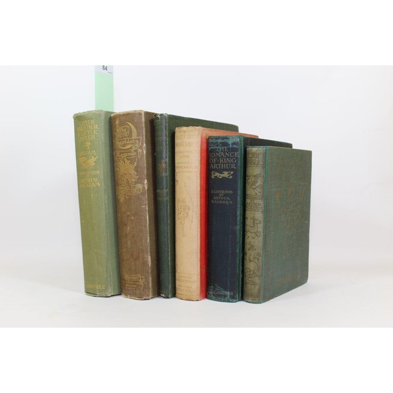 Rackham, Arthur, illustrator. Little Brother, Little Sister and Other Tales by the Brothers Grimm, first edition, tipped-in coloured plates, a few with corners creased, original cloth gilt, 4to, London: Constable and Co., 1917; The Ingoldsby Legends, first edition, tipped-in coloured plates, guards, some spotting, original cloth gilt, rubbed, 4to, London: J.M. Dent, 1907; and 4 others illustrated by Rackham, 4to (6)