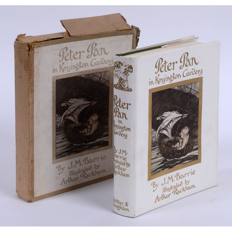 Rackham, Arthur, illustrator. Peter Pan in Kensington Gardens... by J. M. Barrie, octavo edition, 24 coloured plates, tissue guards, 2 loose, original cloth, original pictorial dust-jacket gilt, extremities slightly chipped, in publisher's original box, a.f., 8vo, London: Hodder and Stoughton, [1913]