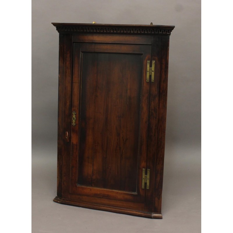 AN 18TH CENTURY YEW WOOD CORNER CUPBOARD, the panelled door enclosing a three shelf interior, height 105cm