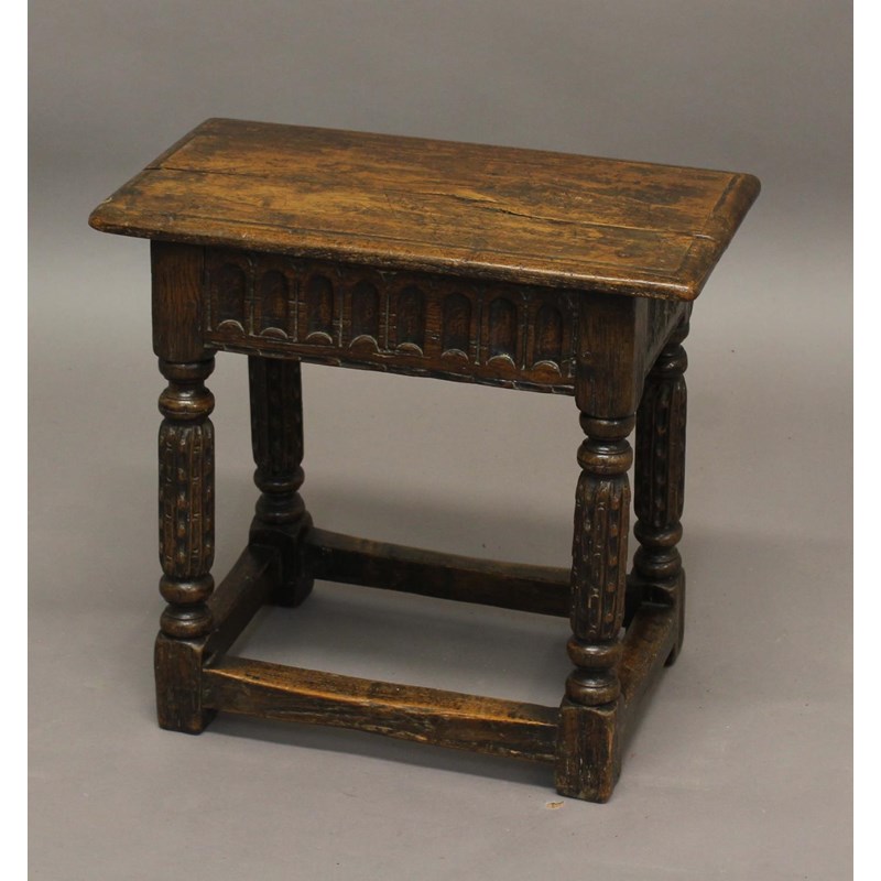 A 17TH CENTURY CARVED OAK JOINT STOOL,