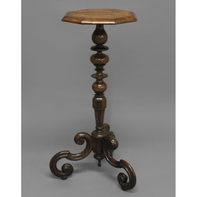 A 17TH CENTURY WALNUT CANDLESTAND, the octagonal top on a tirned and knopped column tapering to a scrolling tripod base, height 92cm