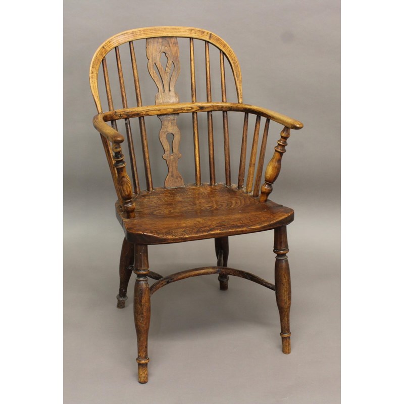 AN ASH AND ELM WINDSOR ARMCHAIR, with pierced splat above a solid seat on turned supports with crinoline stretcher, height 85cm, width 54cm, depth 40cm
