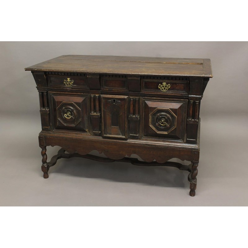 late 17th century and later, the rectangular top above a shallow frieze drawer and a further drawer, the panelled front with central concave arch flanked by turned columns, on a later base with wavy frieze and stretcher, height 85cm, width 123cm, depth 66cm
