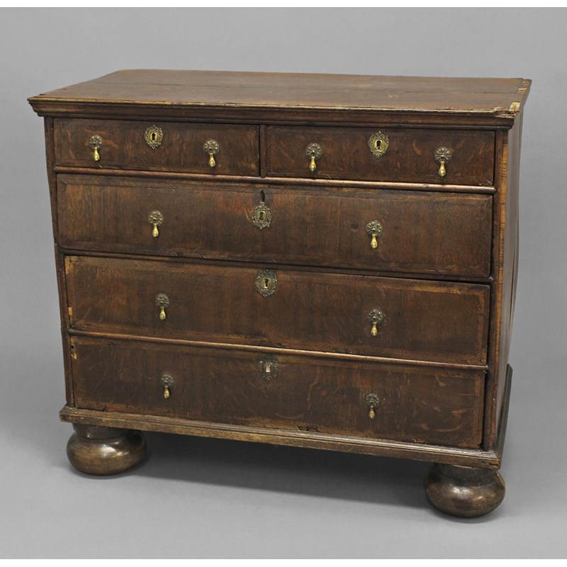 with two-short-over-three-long feather banded drawers with brass mask drop handles, on bulbous bun feet, height 92cm, width 106cm, depth 55cm