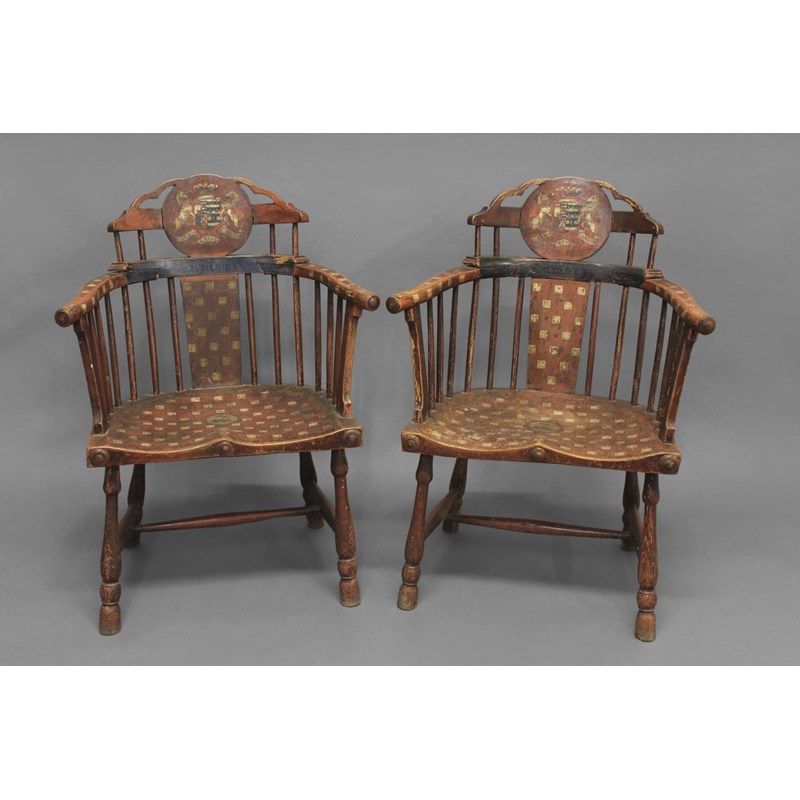 each with a stick back and sides below a pierced cresting with oval medallion painted with a coat of arms with motto on a banderole above MDCC Enmore LVI (for Enmore Castle 1756), the saddle shape seat painted with a crest, on turned legs joined by stretchers, height 97cm, width 70cm