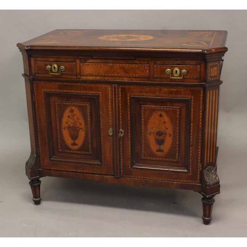 converted to a washstand, the hinged top inlaid with sunbursts and flowering urn enclosing a washstand interior with folding shelves, above two drawers and cupboards with further inlay, raised on carved supports, height 88cm, width 101cm, depth 55cm
