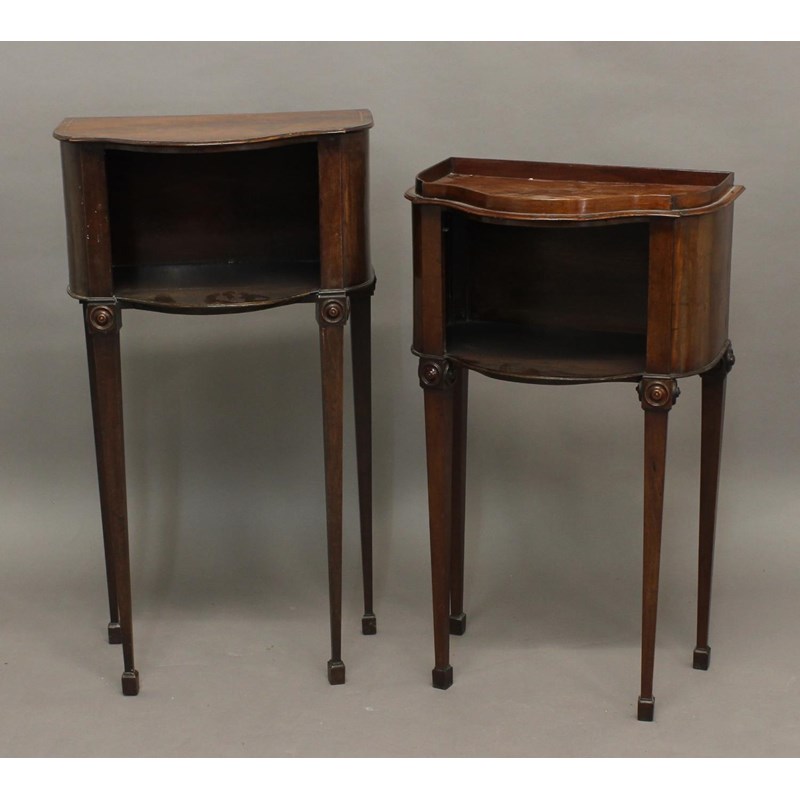 A GEORGE III MAHOGANY SERPENTINE BEDSIDE CABINET, the galleried top above an open cupboard on tapering square section legs with carved roundels, height 82cm; together with a similar cabinet, height 89cm (2)