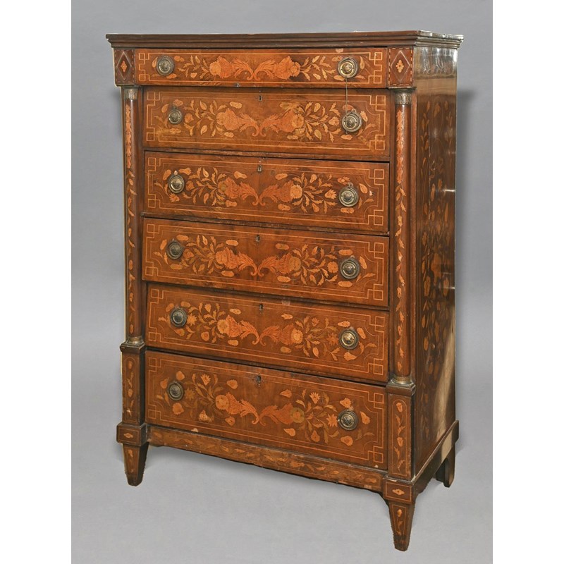 AN EARLY 19TH CENTURY DUTCH MARQUETRY TALLBOY, the six drawers flanked by brass mounted columns, inlaid throughout with scrolling leaves and flowers, on tapering square section feet, height 154cm, width 103cm, depth 51cm