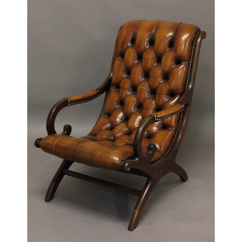A LEATHER X-FRAME LIBRARY CHAIR, 19th century, the mahogany frame with scrolling arms and top rail, height 92cm, with 57cm, depth approx. 91cm