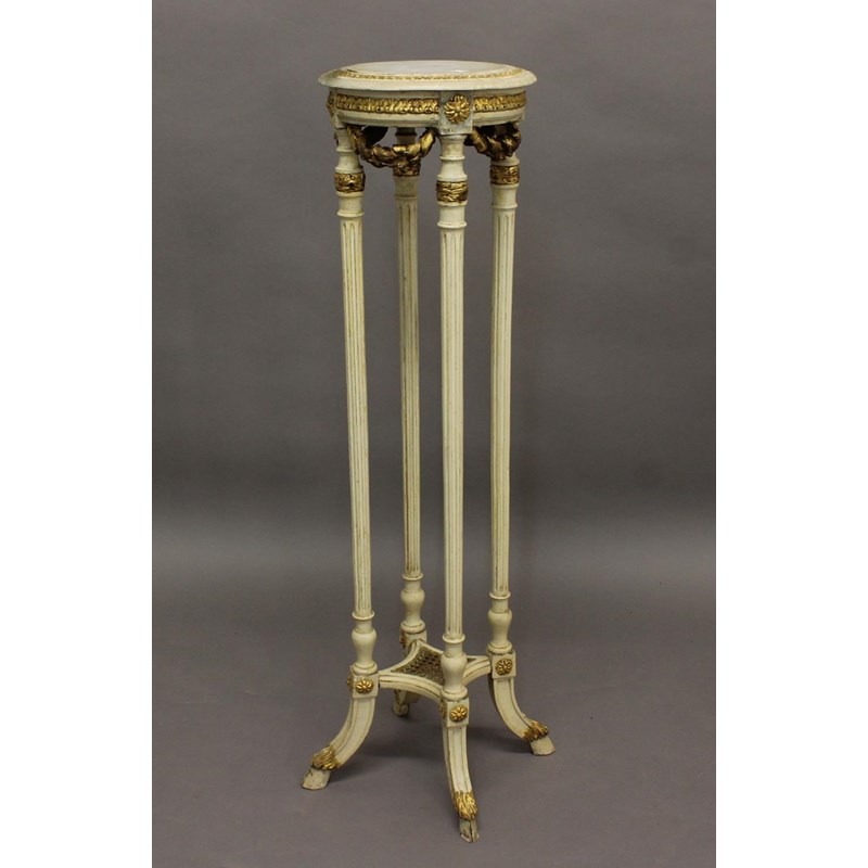the circular top with marble inset above gilt swags, on four fluted columns linked by a platform and outswept, cloven feet, height 108cm