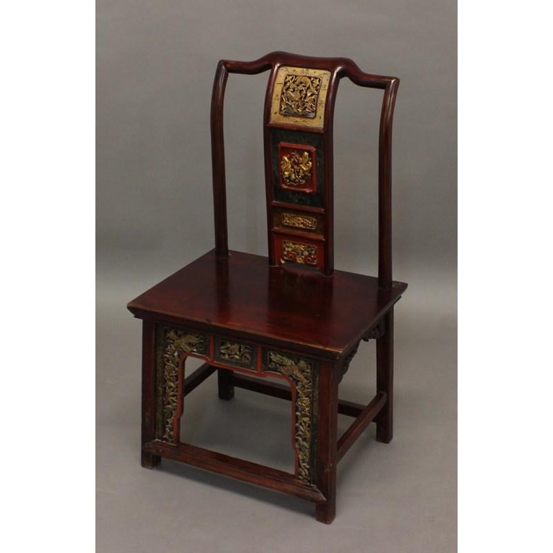 A CHINESE HARDWOOD HALL CHAIR, stained red, the splat panels detailed with dragons, figures and bats above a solid seat and pierced apron, height 89cm