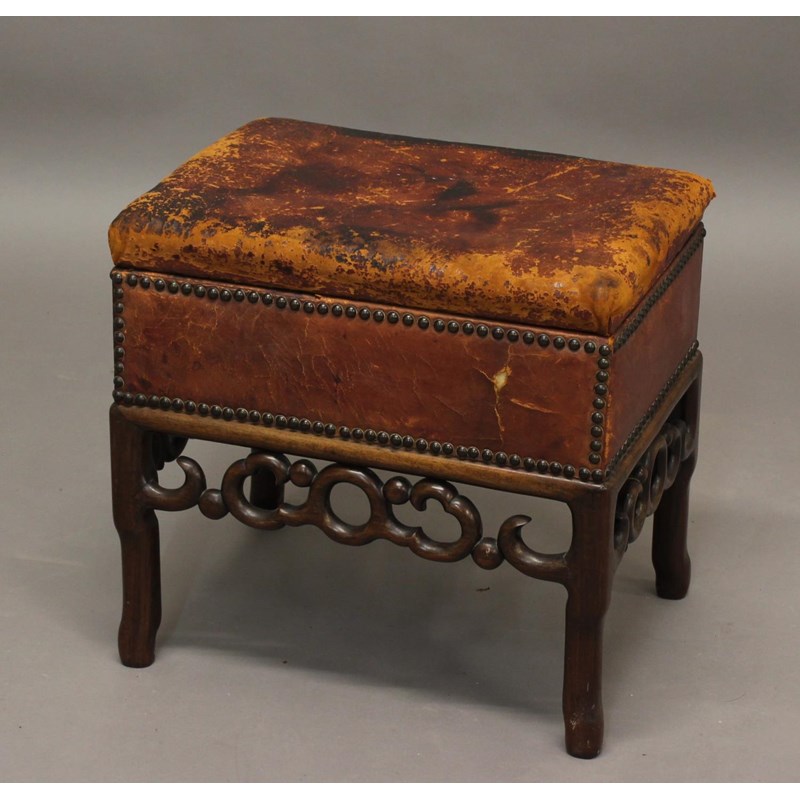 with a rectangular leather covered rising seat with round headed nailed borders on a scrolling hardwood base with pierced frieze, height 46cm, width 50cm, depth 35cm
