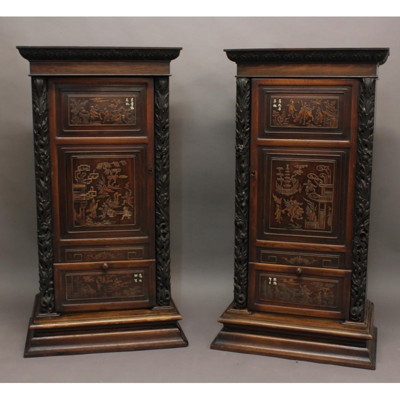 late 19th or early 20th century, the tops with carved cornice above panelled cupboards and drawers depicting warriors in landscapes (and others), flanked by carved columns, height 128cm, width 75cm, depth 42cm (2)