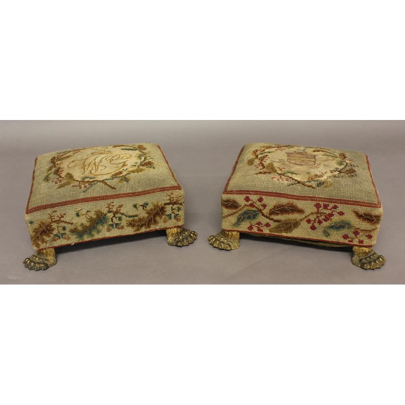 one crested, the other initialled, the sides embroidered with foliage and berries, each on brass lion claw feet, height 15cm, width 35cm (2)