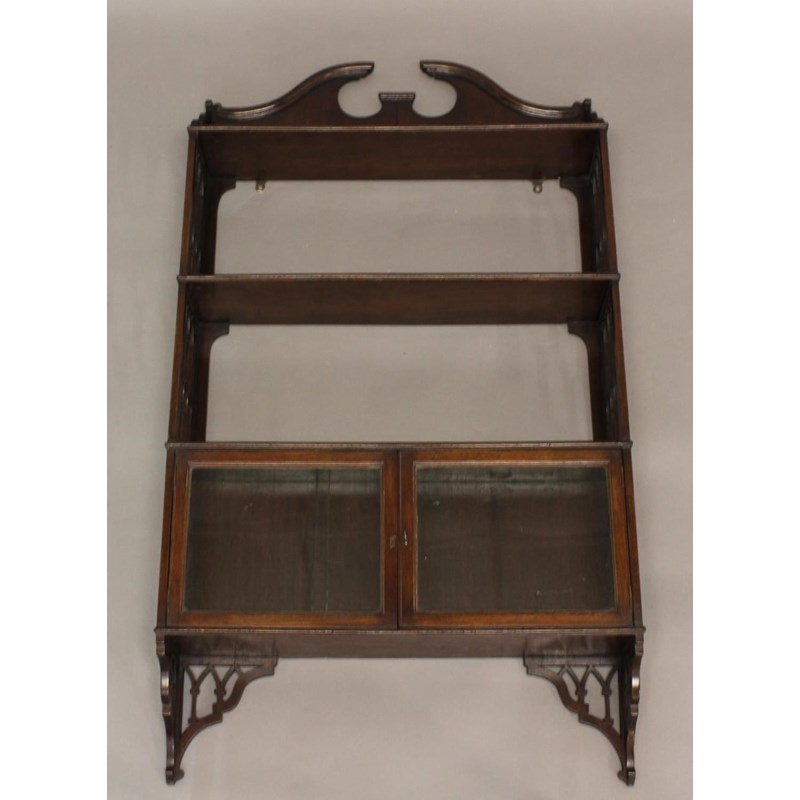 A MAHOGANY WALL SHELF, late 19th or early 20thC, with three open shelves between pierced sides above two glazed cupboard doors, height 114cm, width 62cm