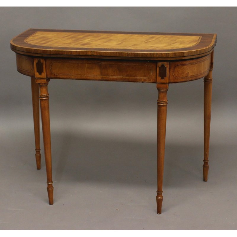 A REGENCY SATINWOOD AND MAHOGANY CARD TABLE, the top crossbanded with kingwood enclosing a red baize interior above a frieze with further crossbanding, on turned tapering legs, height 73cm, width 92cm, depth 46cm