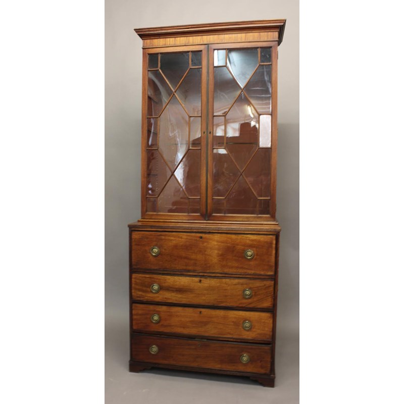 the glazed top with moulded cornice on a base with fitted secretaire section above three further drawers, brass handles to the sides, height 224cm, width 93cm, depth 51cm