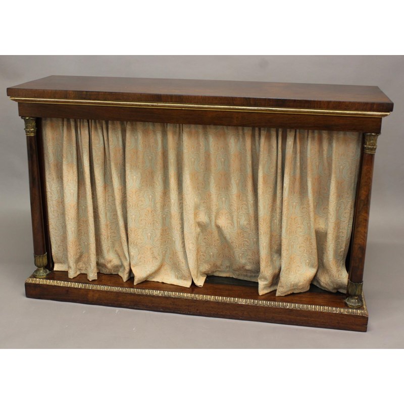 the rectangular top above curtained bookshelves flanked by turned columns with gilt mounts, height 92cm, width 145cm, depth 44cm
