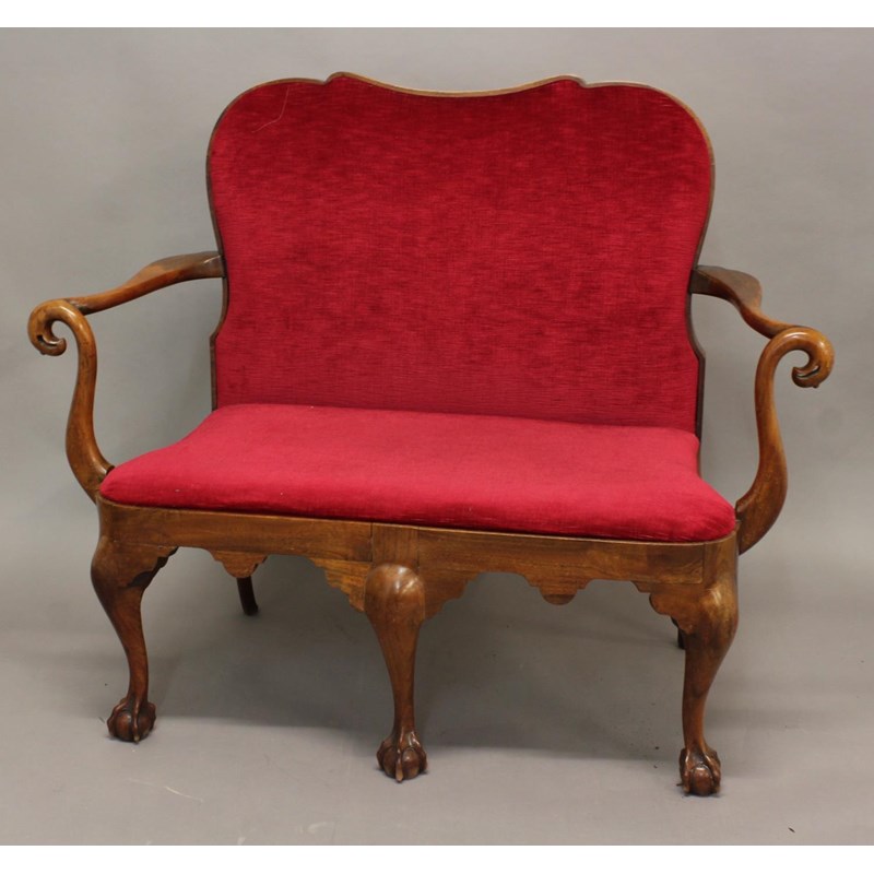 the wavy top rail above outswept scrolling arms and upholstered drop-in seat, on ball and claw feet, height 106cm, width 128cm, depth 62cm
