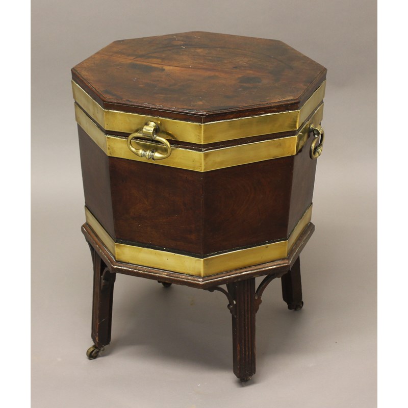 A GEORGE III BRASS BOUND MAHOGANY WINE COOLER, of octagonal form with three brass handles, on reeded and fret carved legs, the interior with a galvanised liner, height 61cm, width 47cm