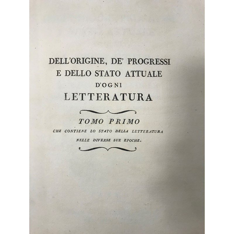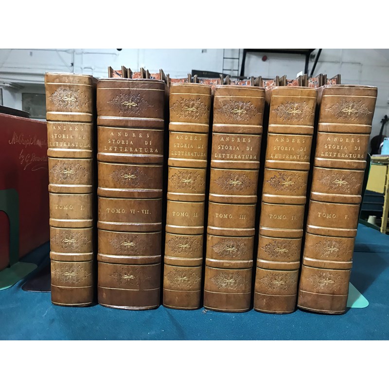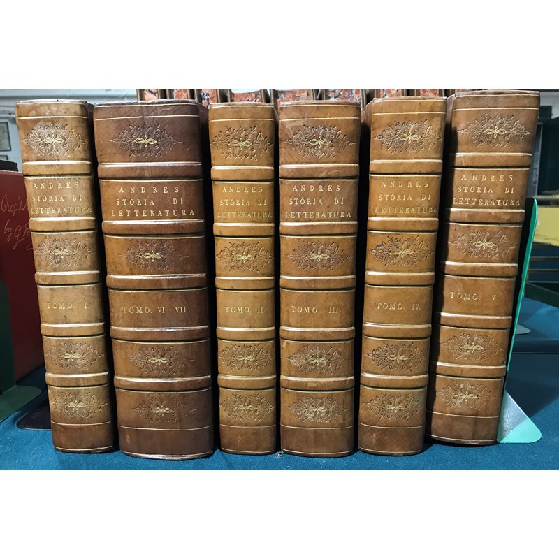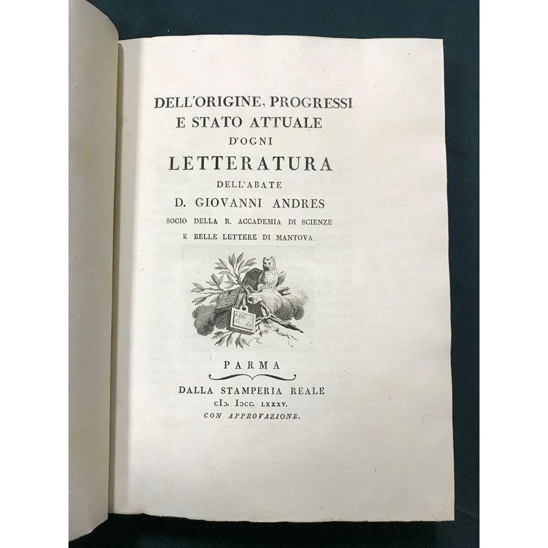 Andres, D. Giovanni. Dell'origine, progressi e stato attuale d'ogni letteratura, 7 [of 8] volumes bound in 6, LARGE PAPER COPY, half-titles, engraved title vignettes, contemporary polished half calf, bookplate of Merthyr Guest, folio, Parma: Dalla Stamperia Reale, 1785-1799