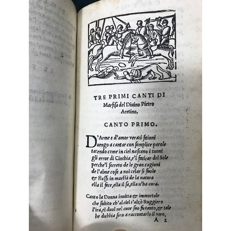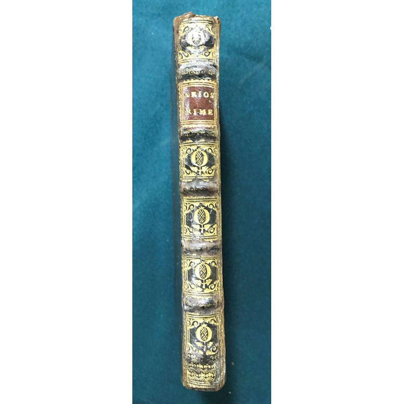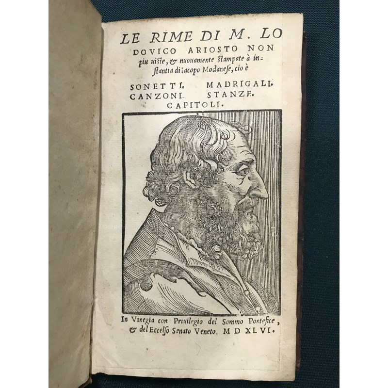 Ariosto, Ludovico. Le Rime di M. Lodovico Ariosto, 3 works in one volume, wood-engraved portrait to title, title cropped and laid down without loss, wood-engraved illustrations, wood-engraved colophon, contemporary mottled calf, spine gilt, 8vo, Venetia: Jacopo Modanese, 1546