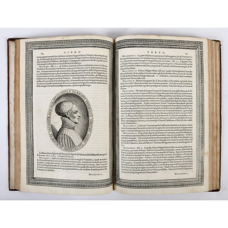 Campo, Antonio. Cremona fedelissima citta et nobilissima colonia de romani : rappresentata in disegno col suo contato et illustrata d'una breve historia delle cose piu notabili..., engraved title, soiled, repaired, engraved dedicatory portrait verso, engraved allegorical frontispiece, 33 engraved medallion portraits and engraved view of a military procession in text, large folding engraved map of Cremona, repaired with minor loss, folding engraved map of the environs of Cremona, 5 architectural engravings on 3 folding plates, minor ink and rust marks, portrait on G3 with small hole, slightly affecting text verso, 8*ii-iii with some discoloration and ink marks, M4 verso soiled, P2 with tear, repaired, P2-3 with light stain, centre, lacks errata, contemporary full calf, rubbed, folio, Cremona: In casa dell' istesso avttore, 1585
