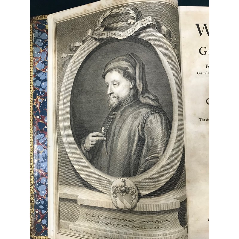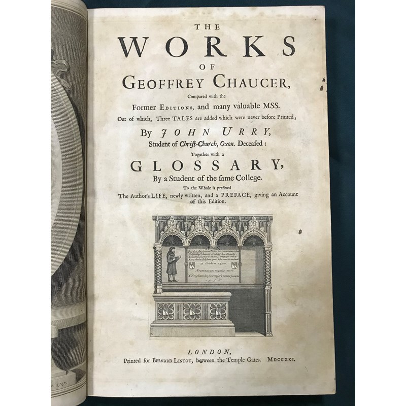 Chaucer, Geoffrey. The Works... Compared with the Former Editions, and many valuable MSS., Out of which, Three Tales are added which were never before Printed; By John Urry, first Urry edition, engraved portrait frontispiece, engraved title vignette, engraved portrait of John Urry, 27 engraved vignettes in text, light browning, minor rust-marks to index, eighteenth century calf, rebacked preserving remains of original spine, folio, London: Bernard Lintot, 1721