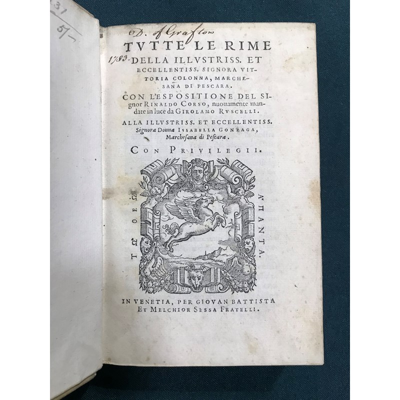 Colonna, Vittoria. Tutte le rime della illustriss. et eccellentiss..., wood-engraved title vignette, wood-engraved initial letters, final registration leaf, title inscribed 'D. of Grafton 1783', some browning and light spotting, contemporary full vellum, spine tooled gilt, from the library of Merthyr Guest, 8vo, Venetia: Giovan Battista, 1558