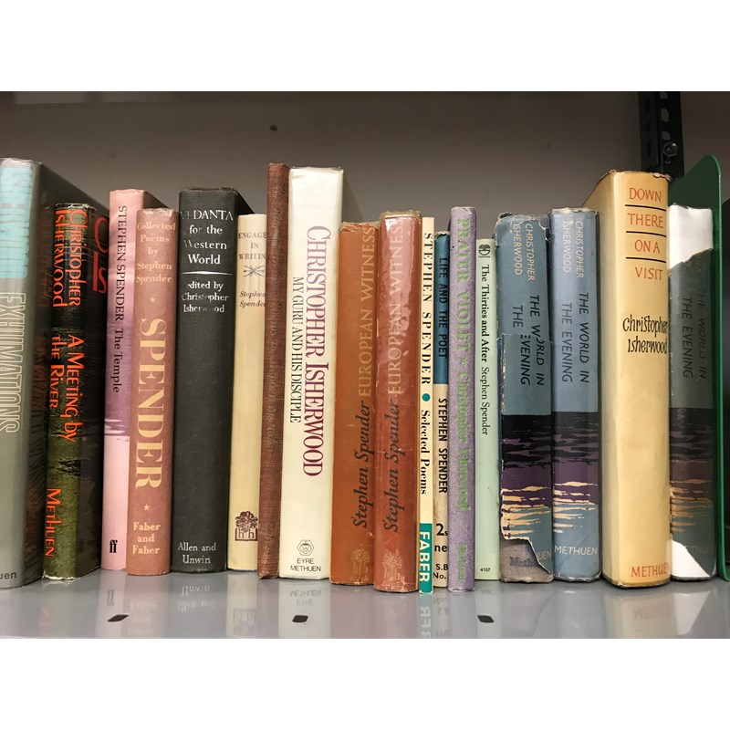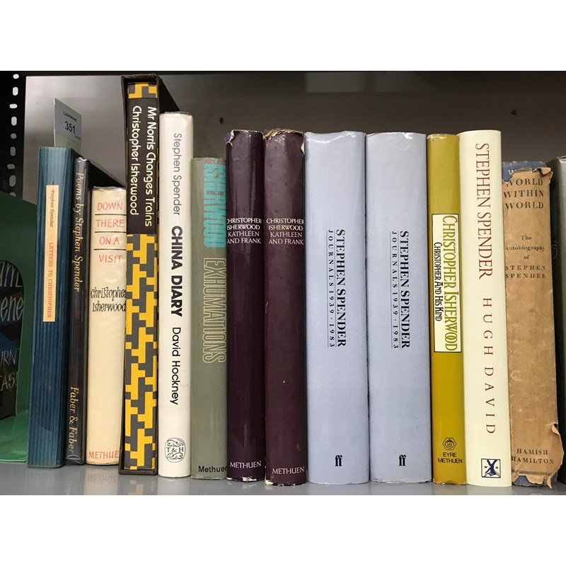 Spender, Stephen. Letters to Christopher, first edition, original boards, 8vo, Santa Barbara: Black Sparrow Press, 1980; Poems, first edition, original cloth, untrimmed, 8vo, London: Faber and Faber, 1932; Isherwood, Christopher. Down there on a Visit, first edition, original cloth, dust-jacket, 8vo, London: Methuen, 1962; and 29 others by or concerning Stephen Spender and Christopher Isherwood, v.s. (32)