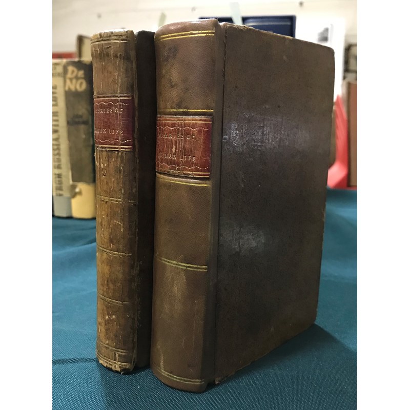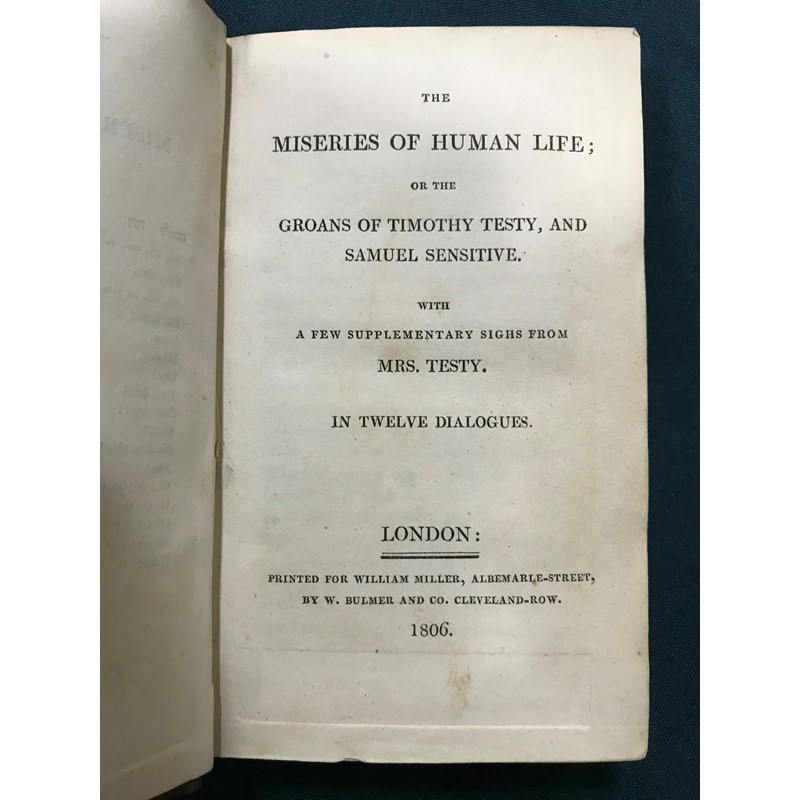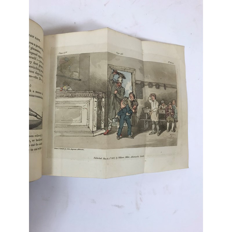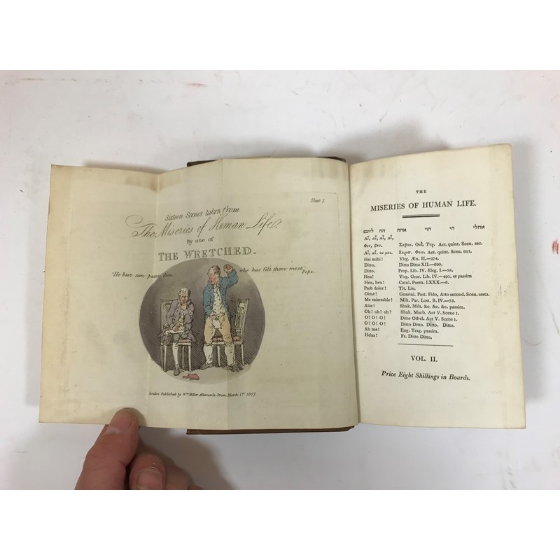 [Atkinson, John Augustus] The Miseries of Human Life, 2 volumes, first edition, half-title, hand-coloured folding engraved additional title and 15 [of 16] hand-coloured folding plates, folding theatre broadside, folding engraved plate 'Miseries Personified', torn, contemporary mottled calf, volume 1 rebacked, 8vo, London: William Miller, 1806-07 [Abbey: Life, 259]