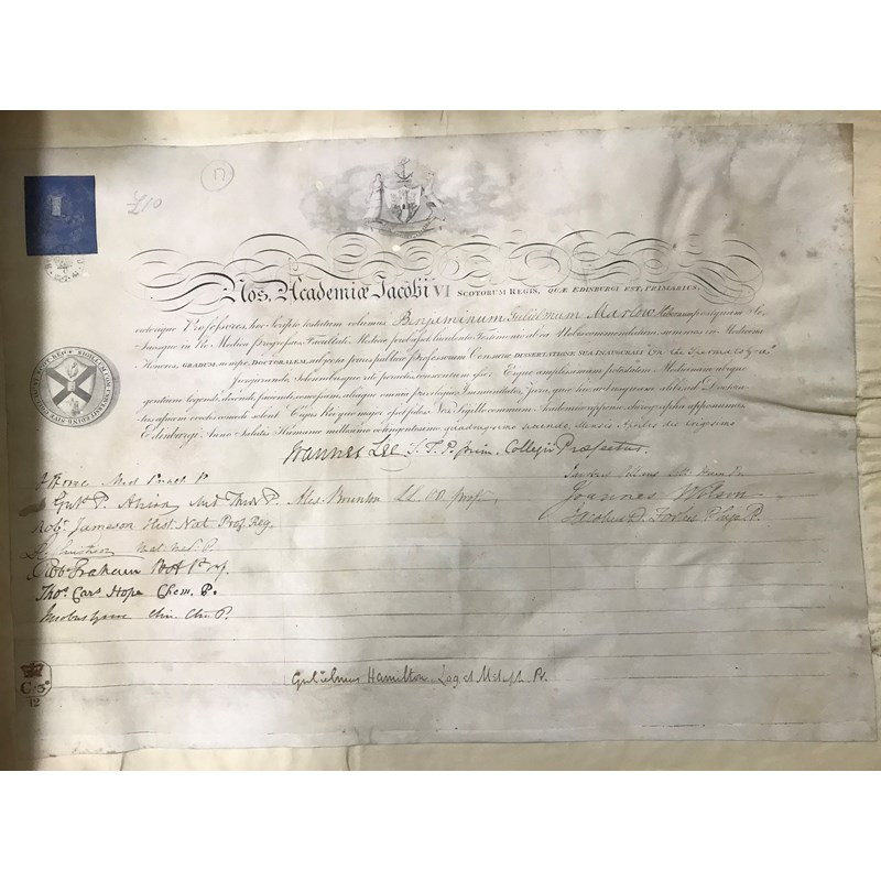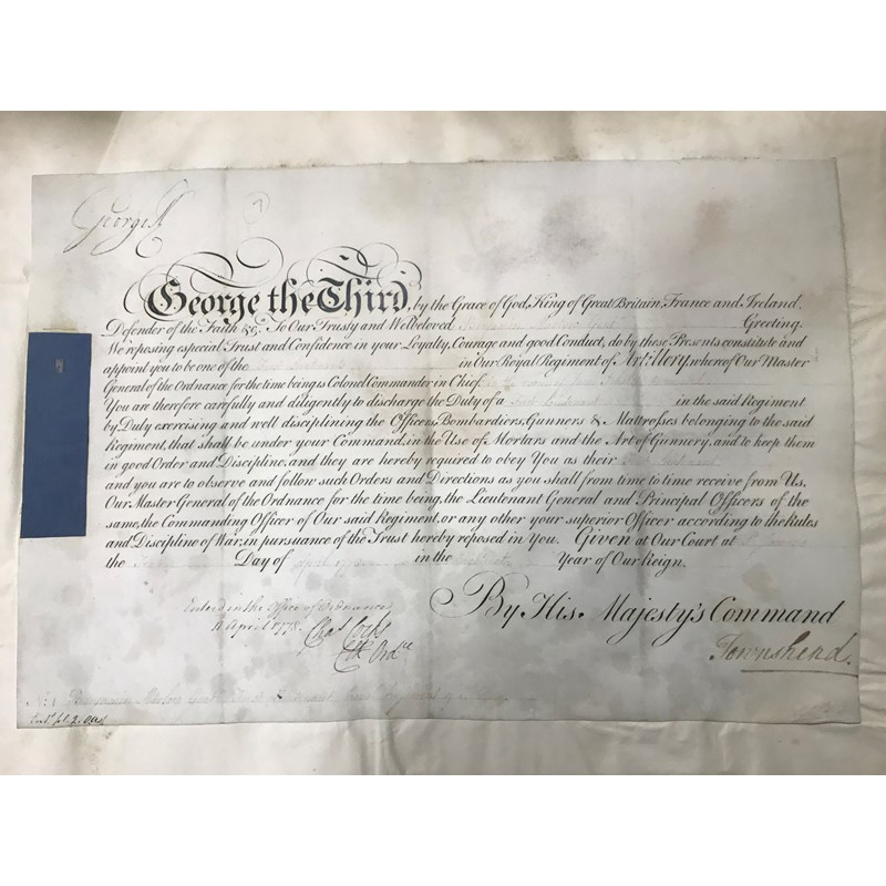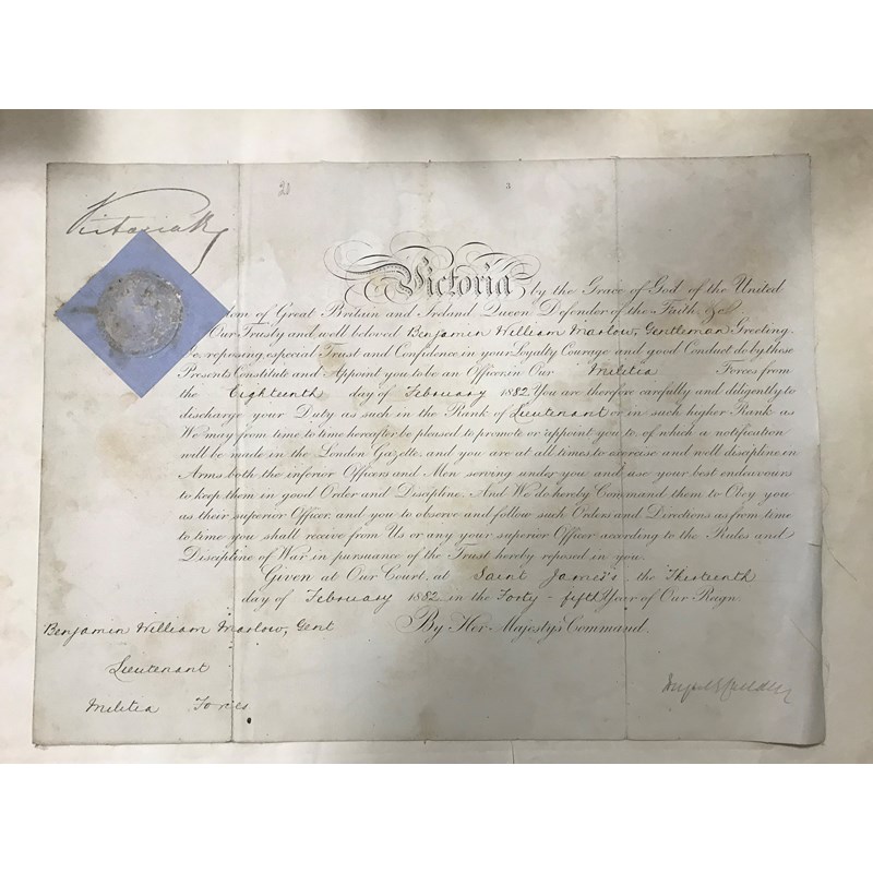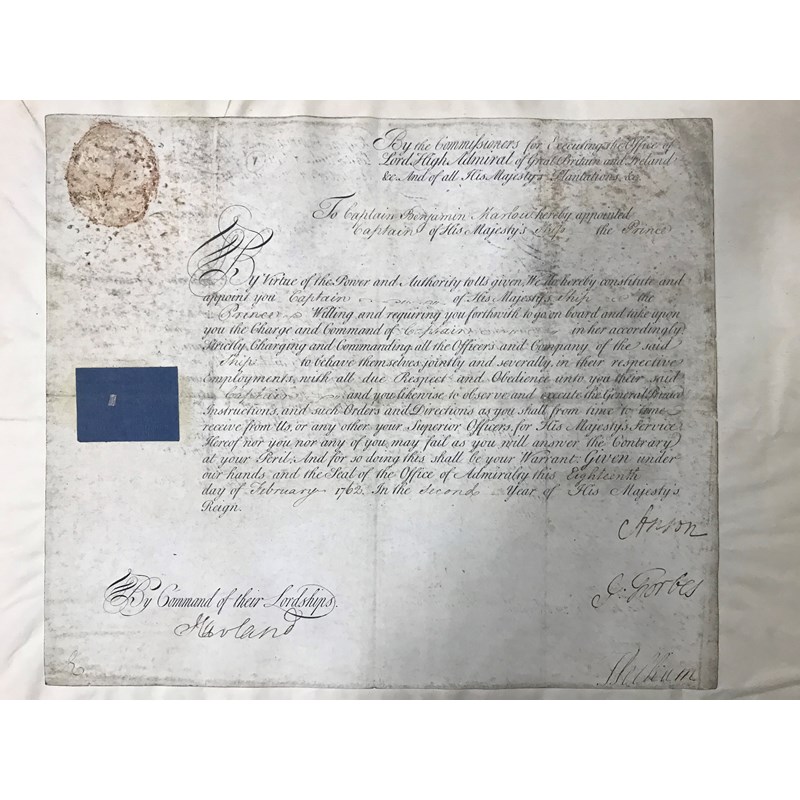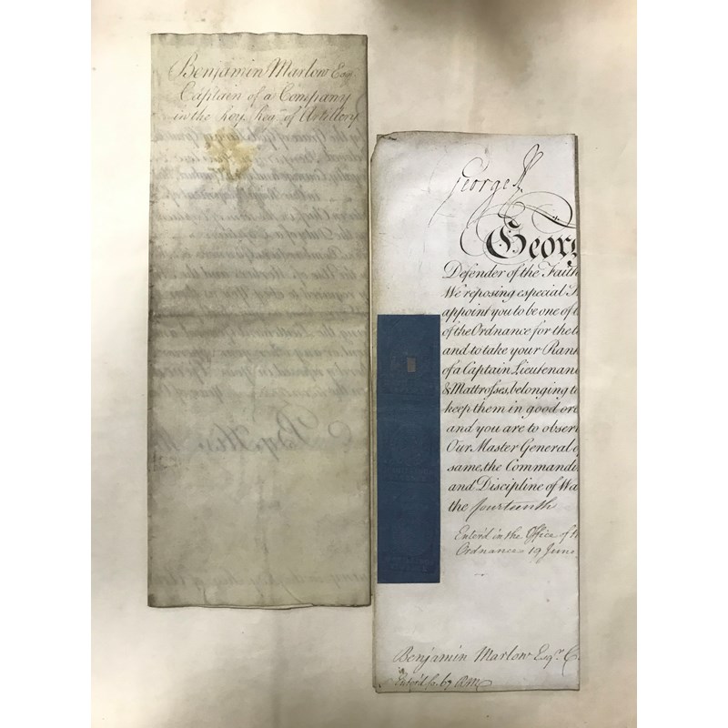 ALBUM, containing Naval, Military and medical appointments relating to Capt. Benjamin Marlow and his descendants (mostly of the same name); with other related documents. Principal contents include: Two documents on vellum appointing Capt. Marlow as captain of the Dolphin, l Feb., 1757; and Prince, 18 Feb., 1763; 10 documents signed by George III with other signatories including Lord Anson, Earl Temple, Marquess Townshend, Henry Seymour Conway, the Dukes of Portland and Richmond, William Pitt the younger; and 4 signed by Queen Victoria. Apart from official appointments other subjects include admission to Trinity House as a "Younger Brother", 2 Nov., 1754; licence to take the surname of Marlow, formerly Vaughan, 9 June 1784; decorative pen and ink memorial, 1p., folio, relating to the death of Capt. Thomas Marlow of the 39th British Regiment, died 15 Oct. 1812, with sketch of the church of San Sebastian, Mexico, where he is buried; document appointing Benjamin William Marlow, surgeon, to the Legion d'Honneur, Paris 7 April l857 [following the Crimean War]. With press cuttings etc. Tipped into large folio, old half leather volume (some soiling). Capt. Benjamin Marlow, later Admiral (1715 - 95). See also lot (American interest, letters relating to land in West Florida).