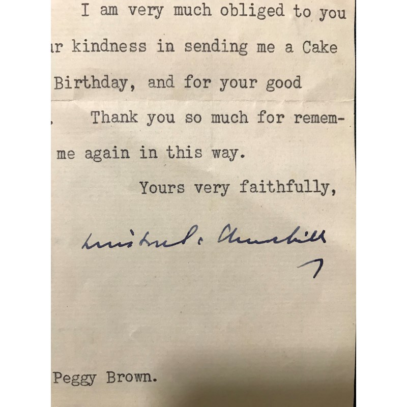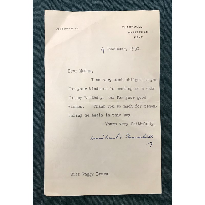 Churchill, Sir Winston. Typed letter signed to Miss Peggy Brown, 'Dear Madam, I am very much obliged to you for your kindness in sending me a Cake for my Birthday, and for your good wishes. Thank you so much for remembering me in this way. Yours very faithfully, Winston S. Churchill', on Chartwell headed paper, dated 4 December, 1950, 1pp., folded