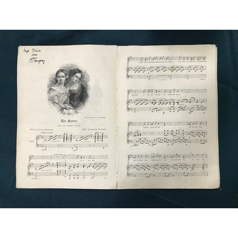 Tennyson, Alfred, Lord. The Sisters, 6pp. of printed music by Arthur Sullivan, words by Alfred Tennyson, with clipped inscription pasted in 'Miss Vivien from A Tennyson', contemporary limp cloth gilt, [c.1888]