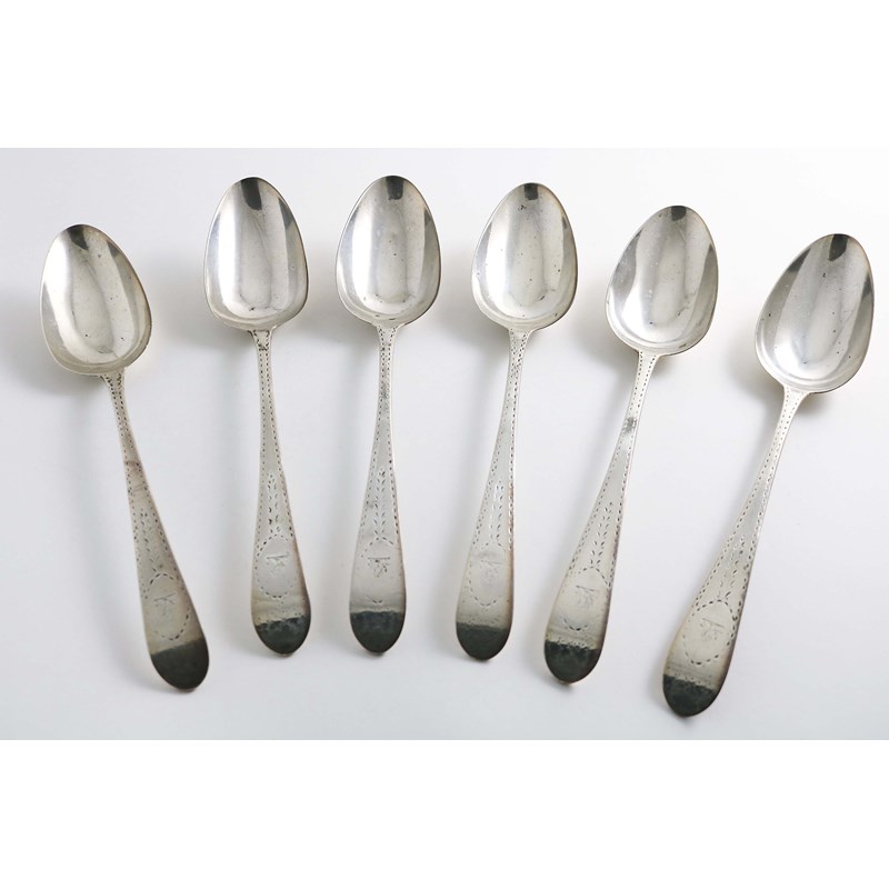 A SET OF SIX GEORGE III IRISH BRIGHT-CUT TABLE SPOONS crested, by John Pittar, Dublin 1795; 14.4 oz (6)