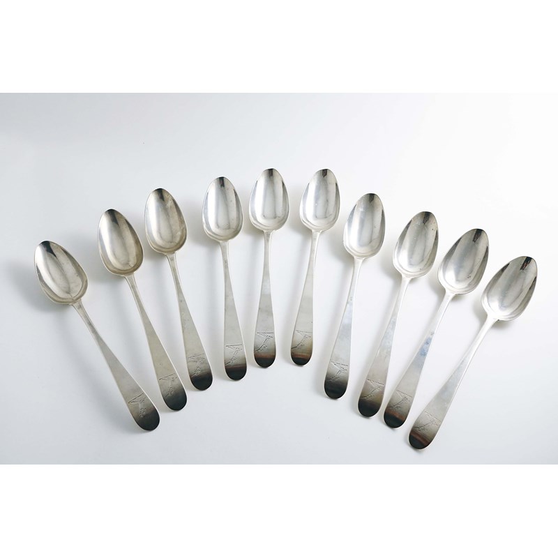 A SET OF TEN GEORGE III IRISH TABLE SPOONS plain with rounded terminals, crested, by John Pittar, Dublin 1789; 25.3 oz (10)