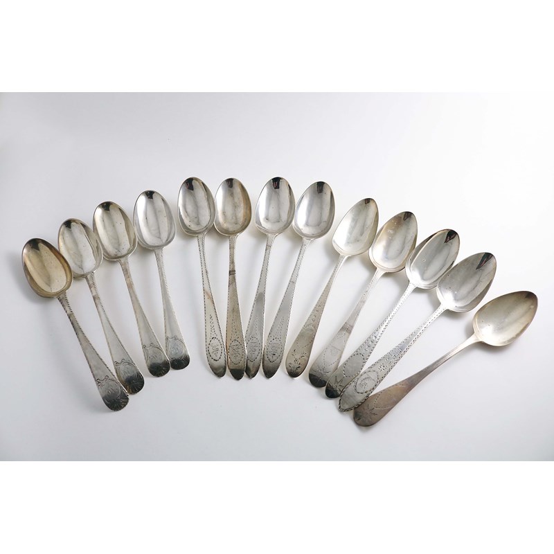 Feather-edge with a chased cartouche on the terminals, initialled by two makers (Michael Keating & John Pittar), Dublin mixed dates, together with nine various George III Irish bright-cut table spoons, all crested except one; 28.3 oz (13)