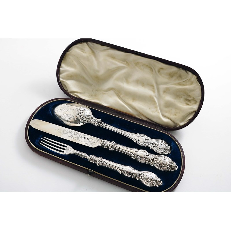 AN EARLY VICTORIAN CASED CHRISTENING KNIFE, FORK AND SPOON