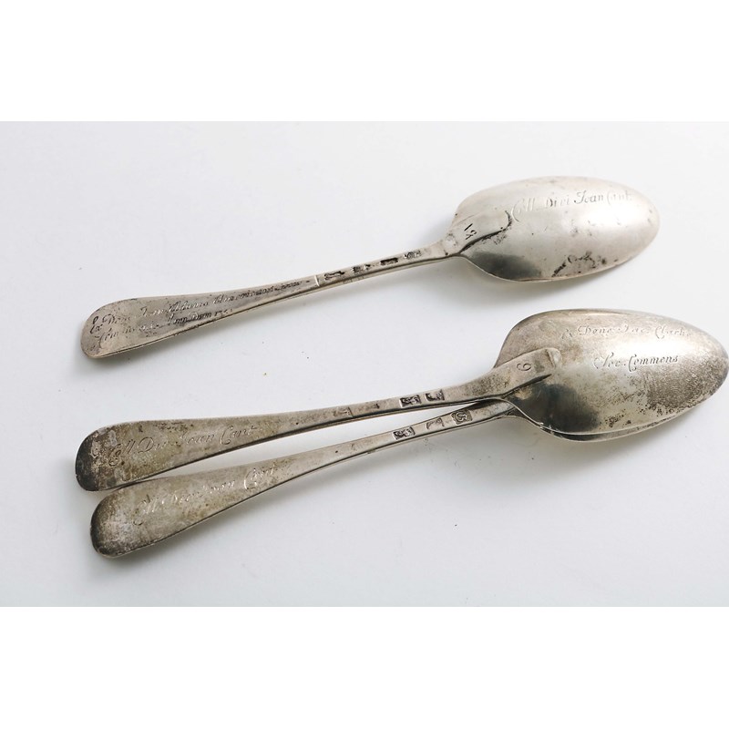 A group of three George II / III Hanoverian pattern "Inscribed" table spoons: two with "Coll.Div.Joan.Cant" on the back of the terminals and "Ex Dono Jac Clarke Soc.Commens" on the back of the bowls and numbered "5" and "6" on the drops, maker's mark rubbed, London 1762 and the third inscribed "Ex Dono Joan.Adams Americani Socio Commens Ann DOM 1751" on the back of the terminal and "Coll.Divi Joan Cant" on the back of the bowl, maker's mark unclear, London 1753; 5.95 oz (3)