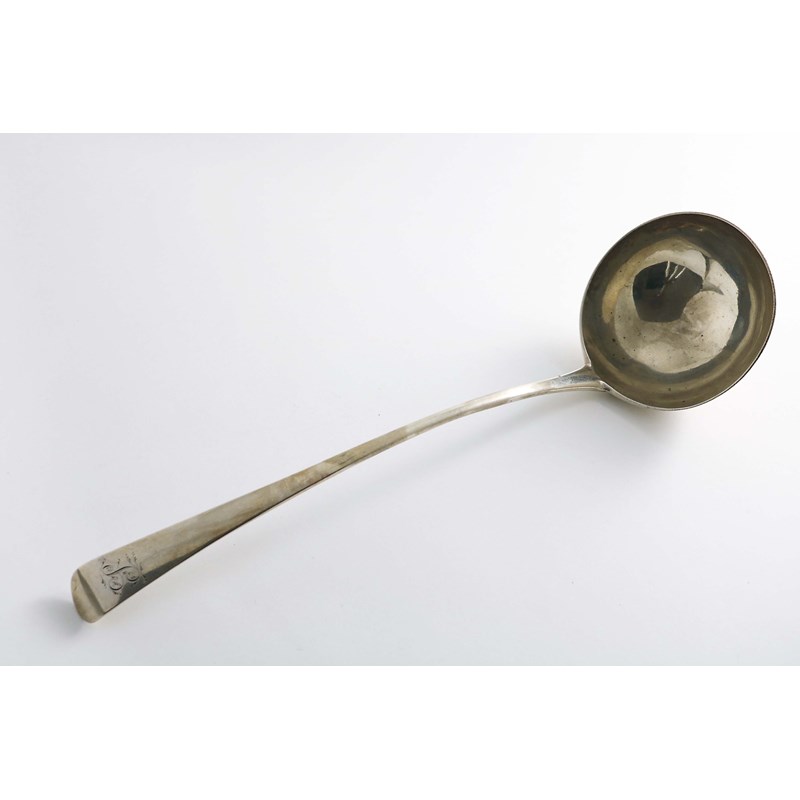 Old English pattern, with a plain circular bowl, initialled "S", maker's mark "IC", Dublin 1765; 13.75" (35 cms) long; 7.9 oz