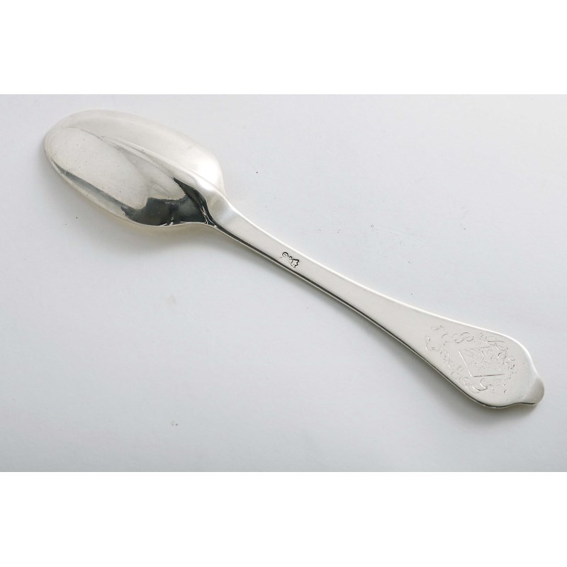 with a plain moulded rattail, engraved on the back of the terminal with a lozenge coat of arms below a coronet, maker's mark only, "GV" or "GW" with a crown and flowers, unascribed 1700-1715; 7.8" (20 cms) long; 2.4 oz