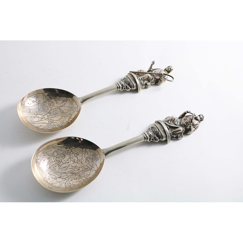 with engraved biblical scenes in the bowls and large seated figure terminals "St. Phillipus" and "St. Jacobus Min", c.1900; 8.7" (22 cms) long; 6.4 oz (2)
