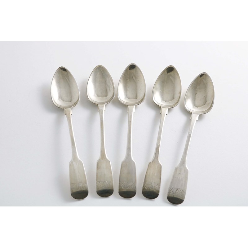 A set of five early 19th century Fiddle pattern tea spoons, initialled "RJL" (script), by Jacques Quesnel of Jersey (JQJ), 1810-30; 2.65 oz (5)